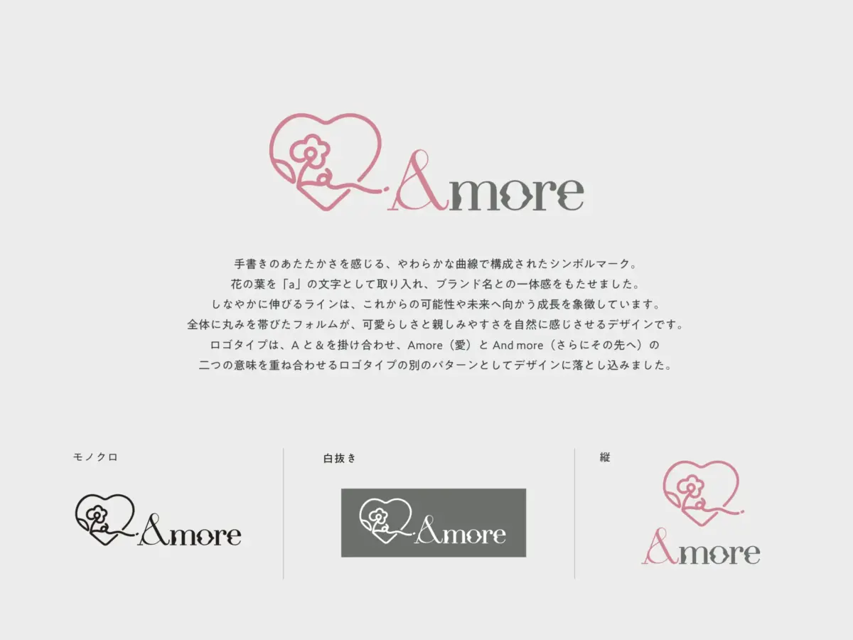 シンボルマークは、ハートや花をモチーフに、線で構成されたマーク、ロゴタイプには、社名のAmore(愛)とAnd more(さらにその先へ)の二つの意味を重ね合わせたいというご要望をデザインに落とし込みました😶💐
